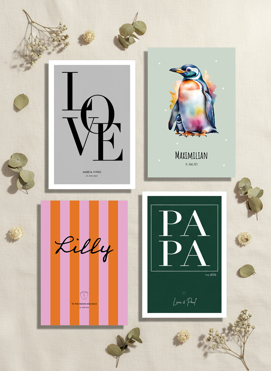 Ob zur Geburt, zum Geburtstag oder für die große Liebe: unsere personalisierbaren Wandbilder erzählen eure Geschichte. Auf hochwertiger Alu-Verbund oder MDF Holzplatte. Kein Rahmen nötig, direkt aufhängen.